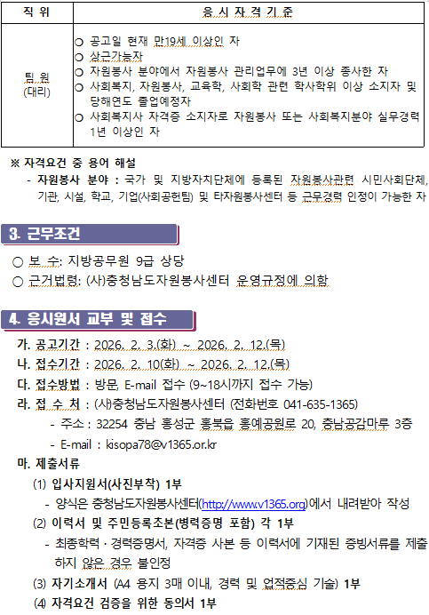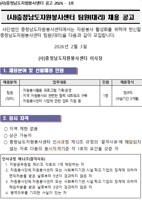 (사)충청남도자원봉사센터 팀원(대리) 채용 공고