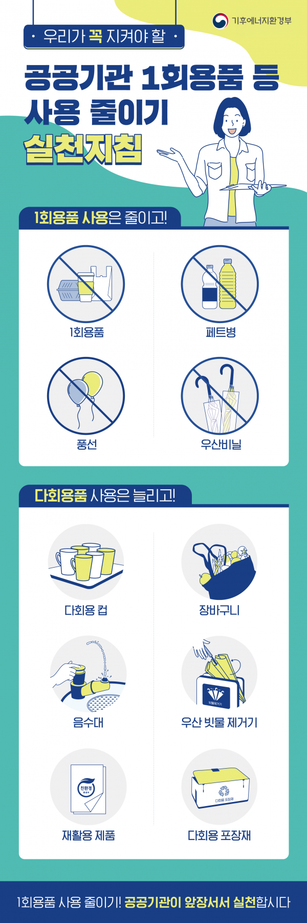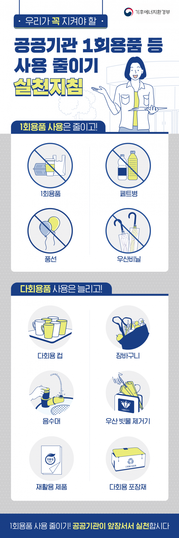 공공부문 1회용품 등 사용줄이기 실천지침 작성일26-04-08 18:47 조회수 133 회 본문 일상 속 작은 실천, 큰 변화를 만듭니다! 공공부문 1회용품 사용 줄이기와플라스틱 감량 등 자원순환 실천과 관련된 내용을 안내드립니다. 우리의 작은 실천이 환경을 지키는 큰 힘이 됩니다.많은 관심과 참여 부탁드립니다 목록