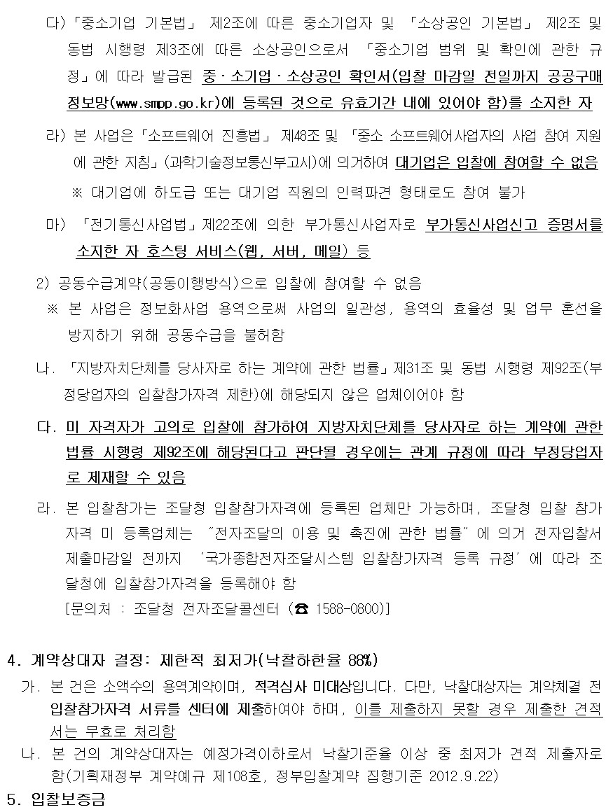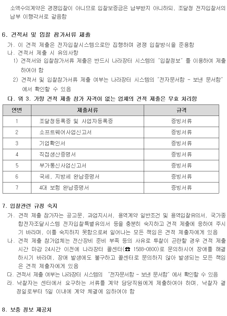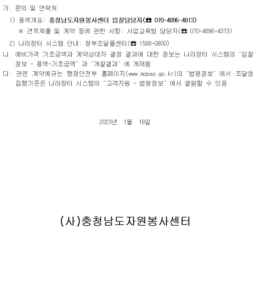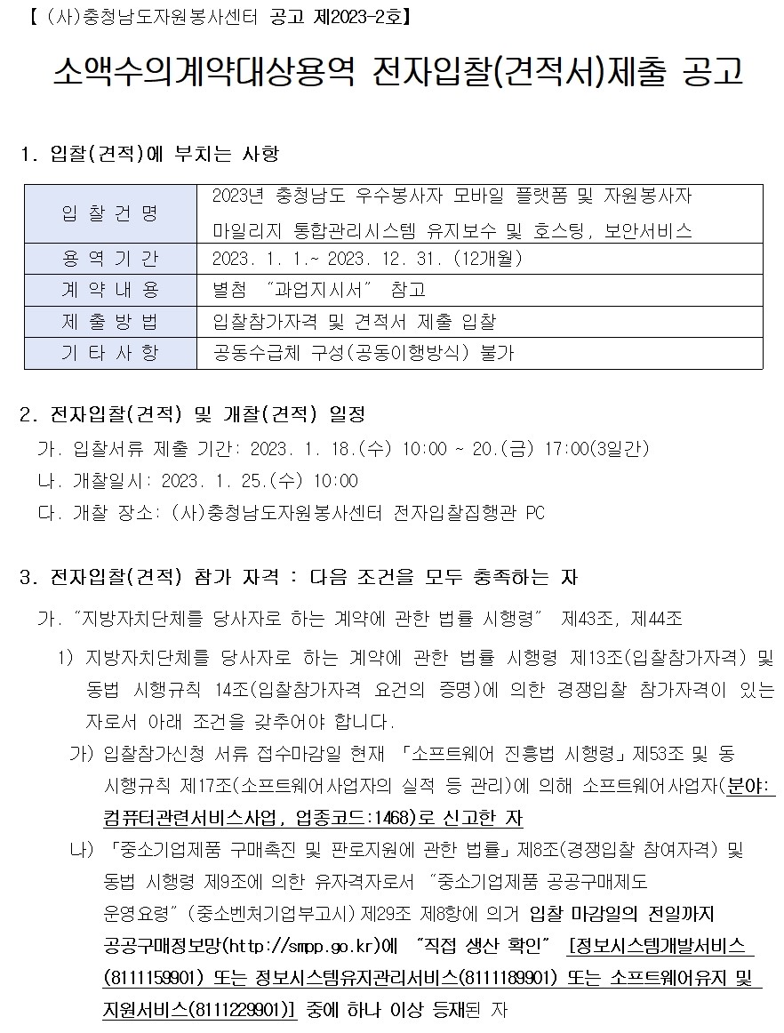 소액수의계약대상용역 전자입찰(견적서)제출 공고 - 우수봉사자 모바일플랫폼, 마일리지 통합관리시스템 유지보수 작성일23-01-18 10:04 조회수 3,393 회 첨부파일 공고 2023-02호 시스템 유지보수 및 호스팅 보안 운영.hwp 2023_과업지시서 카드발급모바일 시스템 유지보수 및 호스팅 보안 운영 .hwp 본문 소액수의계약대상용역 전자입찰(견적서)제출 공고 목록
