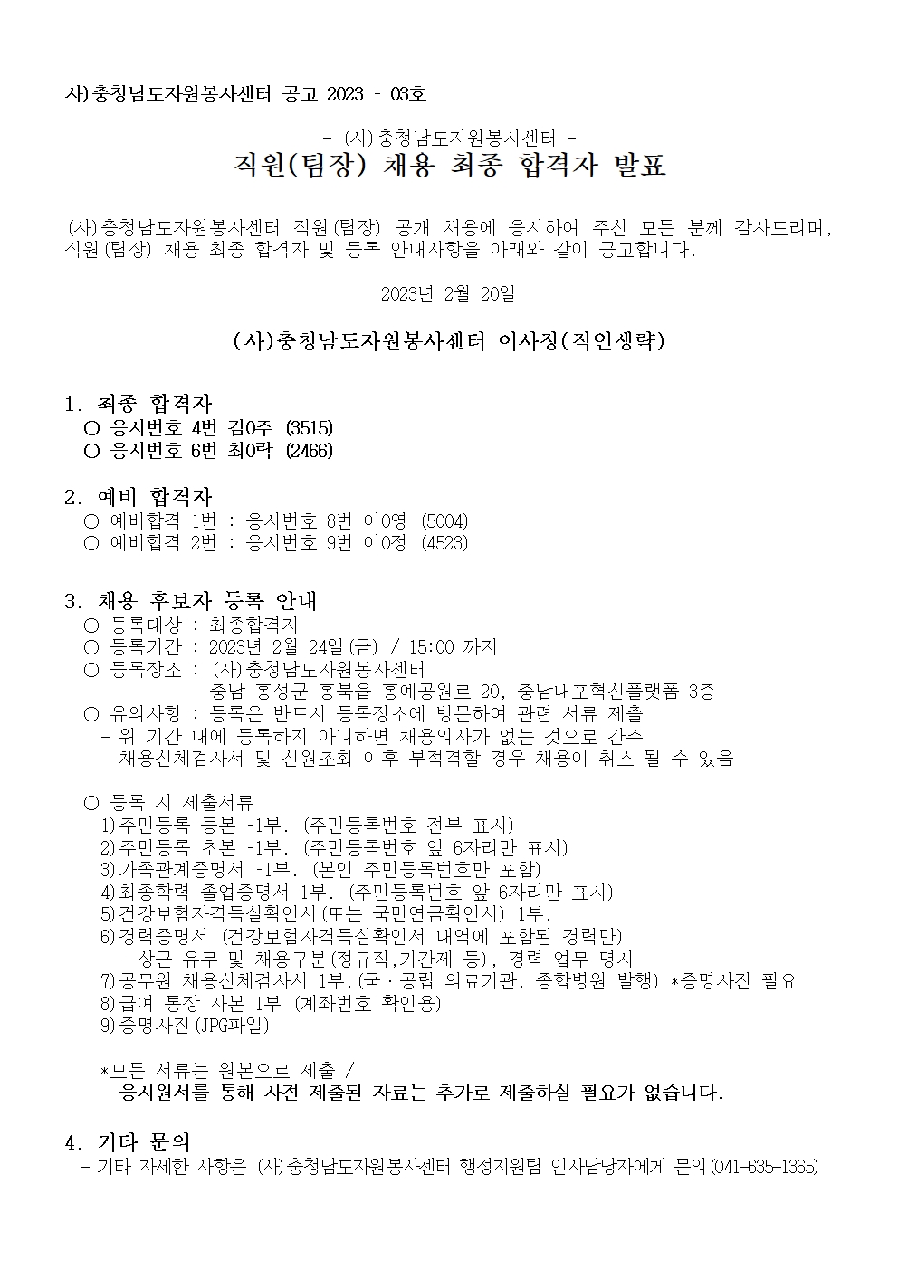 [공고 2023-3] 직원(팀장) 채용 최종 합격자 발표 작성일23-02-20 18:36 조회수 3,884 회 본문 (사)충청남도자원봉사센터 직원 (팀장) 채용 최종합격자를 다음과 같이 공고합니다. 목록