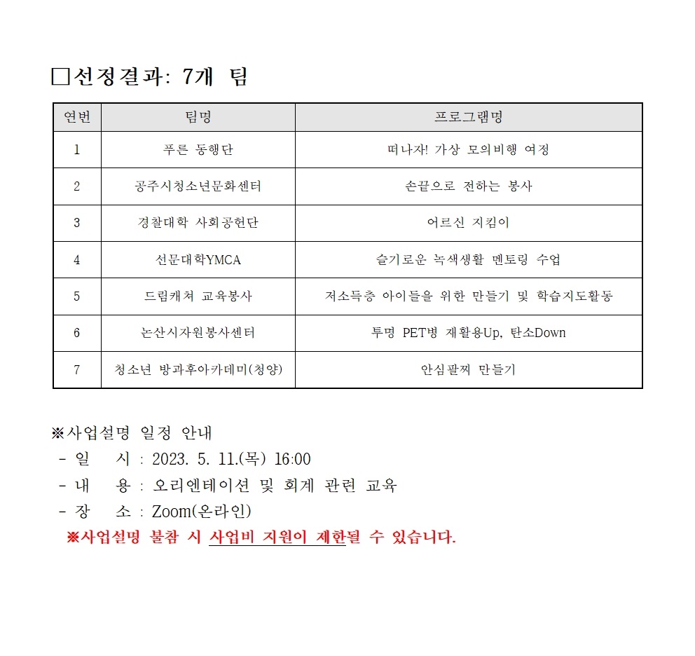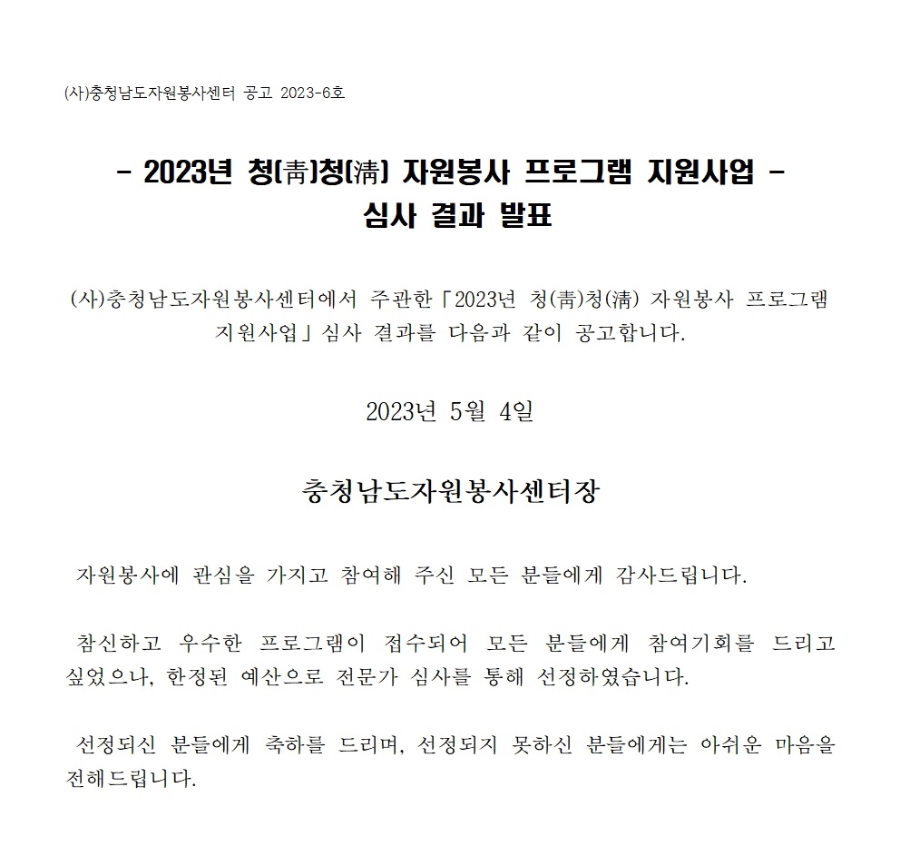 [공고 2023-6] 2023년 청(靑)청(淸) 자원봉사 프로그램 지원사업 심사 결과 발표