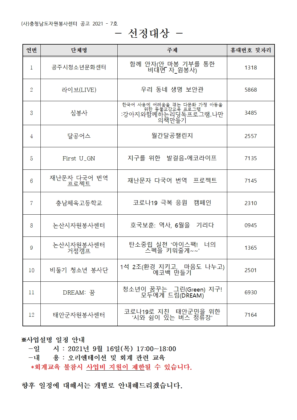[공고 2021-7호] 2021년 비대면 자원봉사 프로그램 지원사업 심사 결과 안내