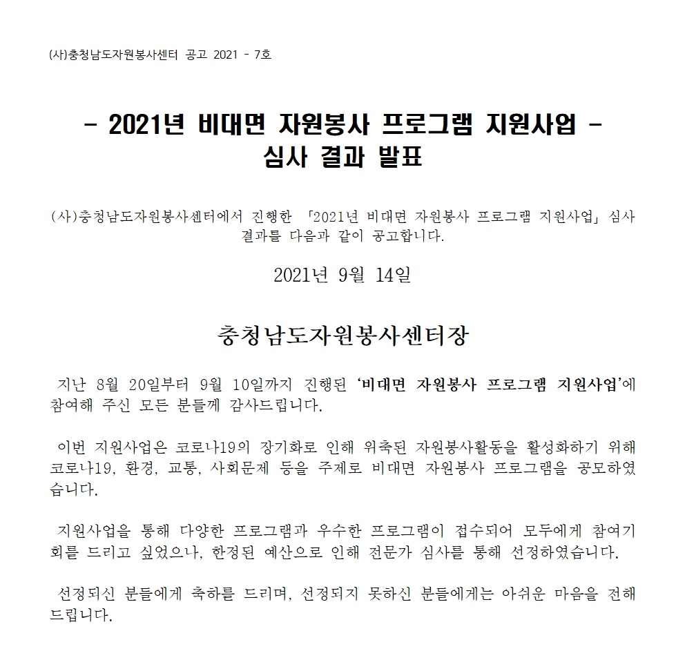 2021년 비대면 자원봉사 프로그램 지원사업 심사 결과를 다음과 같이 공고합니다.