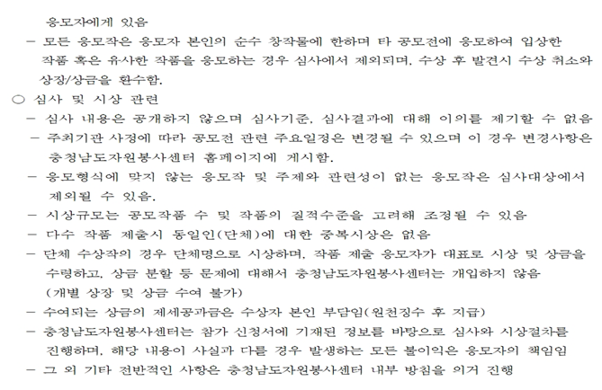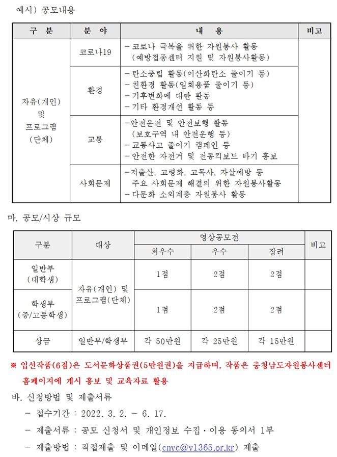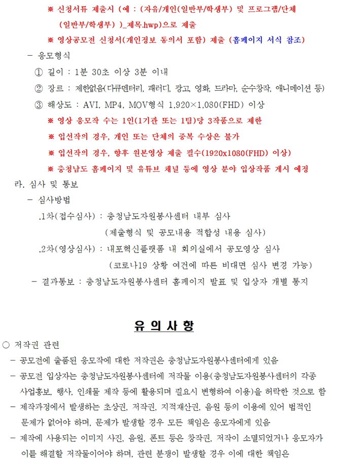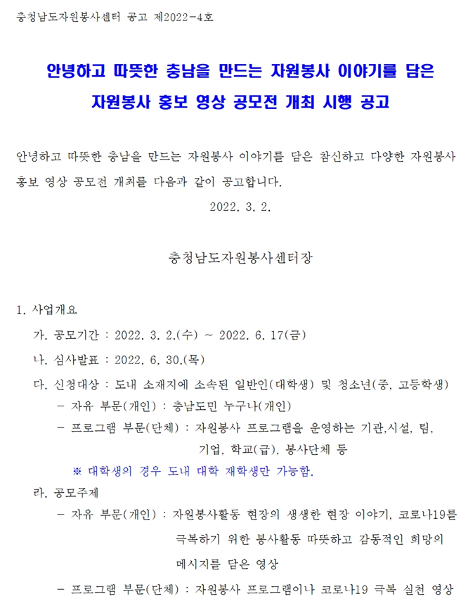 (공고 2022-4호) 자원봉사 활성화를 위한 홍보 영상 공모전 개최 안내 작성일22-02-25 13:32 조회수 3,775 회 첨부파일 공고문_2022년 자원봉사 홍보 영상 공모전 계획안.pdf 서식_홍보영상 공모신청서 및 개인정보 제공 동의서.hwp 본문 "안녕하고 따뜻한 충남을 만드는 자원봉사 이야기"를 담은 자원봉사 홍보 영상 공모전을 개최하오니 많은 관심과 성원 바랍니다. 목록