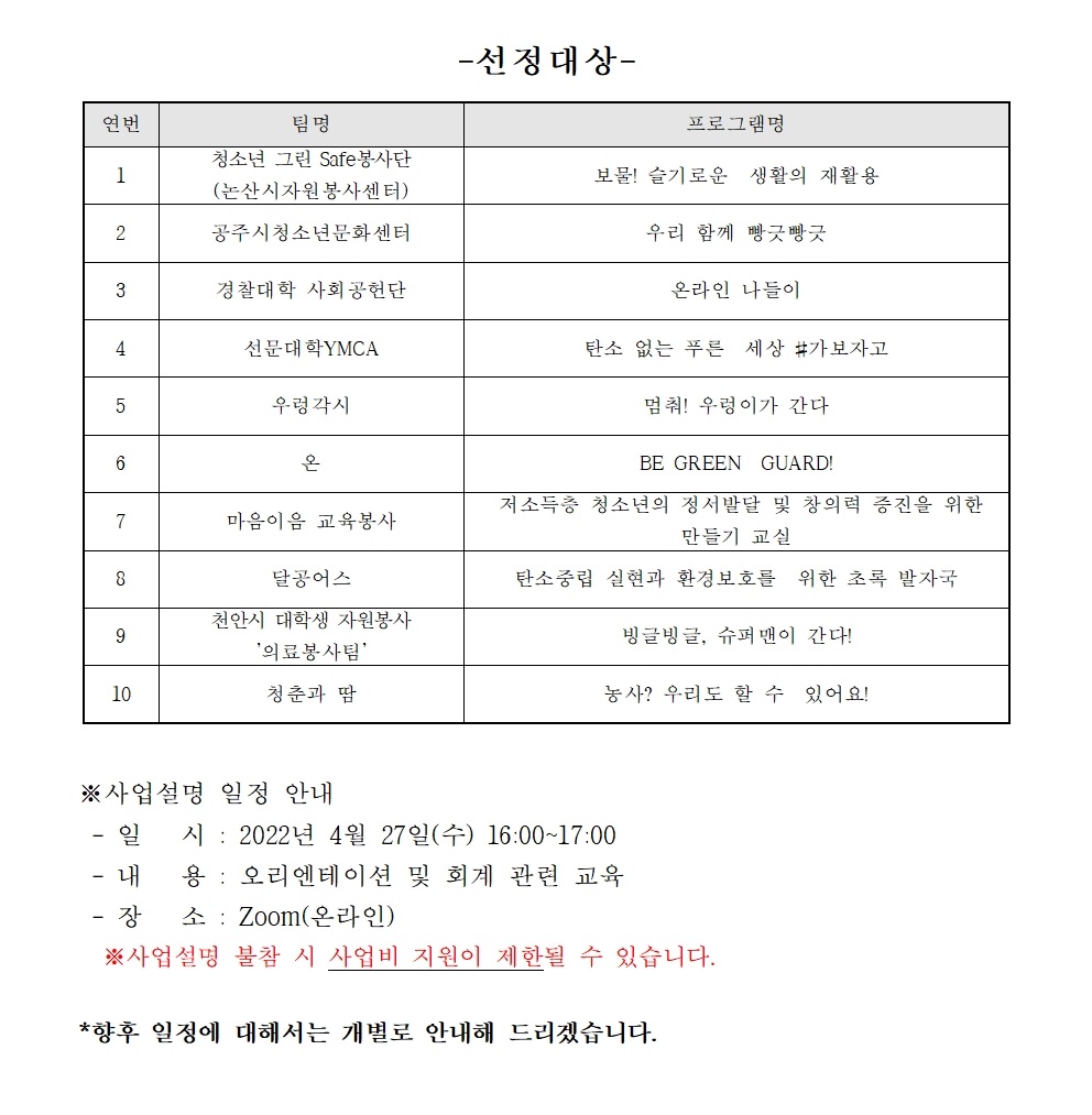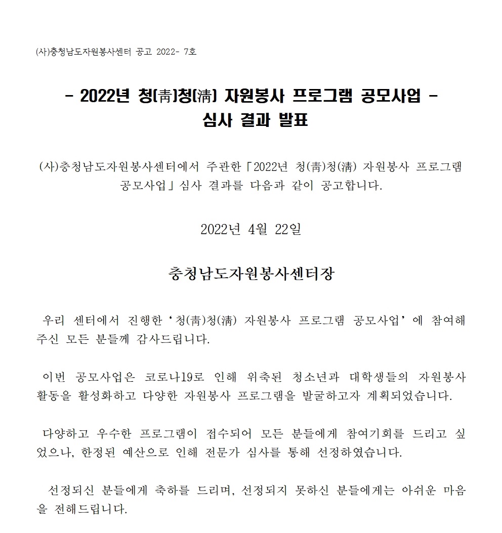 2022년 청(靑)청(淸) 자원봉사 프로그램 공모사업(심사 결과 발표) 작성일22-04-22 13:49 조회수 4,246 회 본문 2022년 청(靑)청(淸) 자원봉사 프로그램 공모사업(심사 결과 발표) 목록
