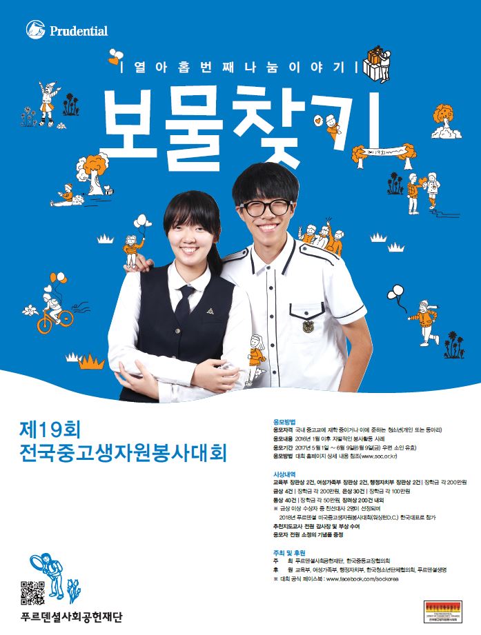 푸르덴셜사회공헌재단이 5월 1일(월)부터 오는 6월 9일(금)까지 ‘제19회 전국중고생자원봉사대회’의 응모 접수를 시작합니다.