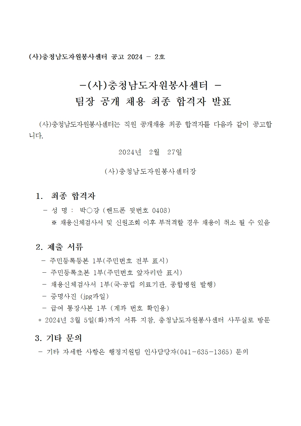 [공고 2024 - 2호] 팀장 공개 채용 최종 합격자 발표