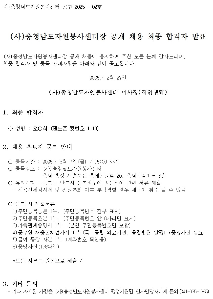 [공고 2025-02] 충청남도자원봉사센터장 공개 채용 최종 합격자 발표