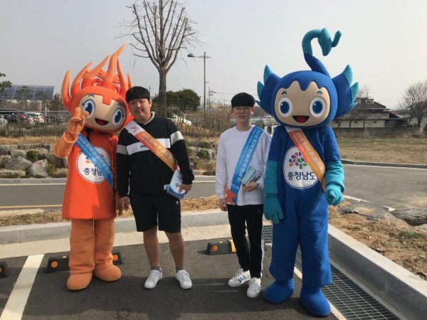 대회 마스코트인 충남이 충청이 탈인형을 쓰고, 기념품과 축전 리플렛을 배부했습니다.