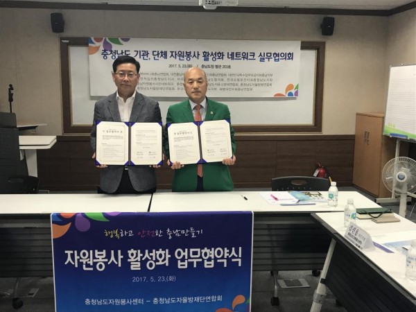 충청남도자원봉사센터(센터장 지순관)와 충남자율방재단연합회(회장 이은국)는 지난 5월 23일(화) 충남도청 별관에서 자원봉사 네트워크 업무협약을 체결했습니다.