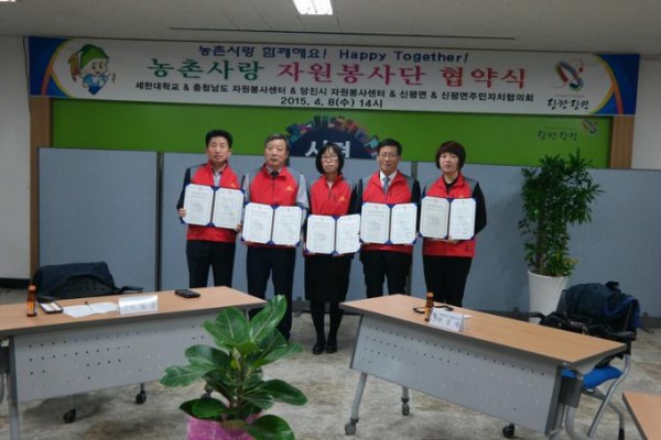 지난 8일 당진시 신평면사무소에서 농촌일손돕기 프로젝트의 일환으로 충남도자원봉사센터, 당진시자원봉사센터, 신평면 주민자치협의회, 세한대학교가 참여하는 자원봉사 협약을 체결했습니다.