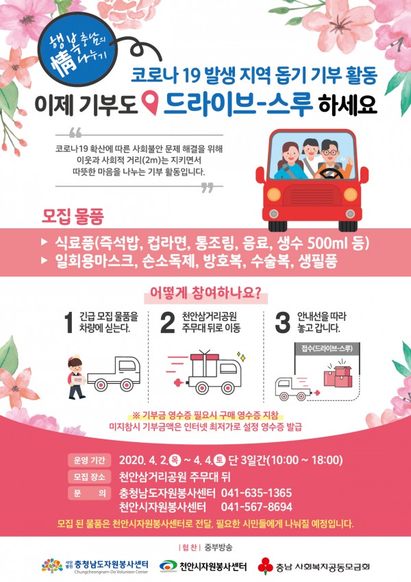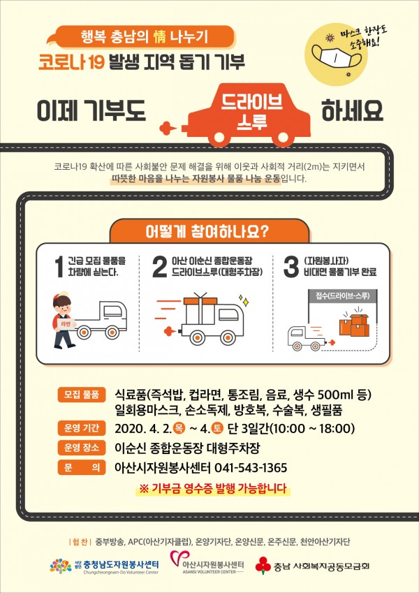 기부물품 모집 활동에 참여를 원하는 시민은 개인 차량을 이용해 식료품, 의료품 등을 천안삼거리 공원 주차장, 아산이순신종합운동장 대형주차장에 마련된 '드라이브-스루' 부스에 기부하면 된다. 기부 물품 구매 영수증을 지참하며 기부금 영수증도 발행된다.