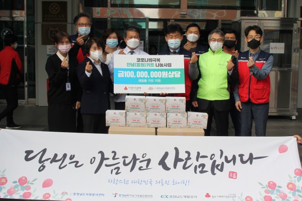 충남사회복지공동모금회의 ‘코로나19 특별 모금액’을 활용하여 제작된 이번 응원키트는 홍삼액, 비타민, 쿠키, 육포, 견과류 등 의료진의 면역력 증강을 위한 품목과 자원봉사자들의 재능기부로 만들어진 캘리그라피 응원 엽서 등으로 구성되었다.