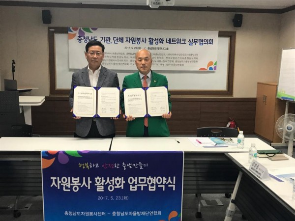 충청남도자원봉사센터(센터장 지순관)와 충남자율방재단연합회(회장 이은국)는 23일(화) 충남도청 별관에서 자원봉사 네트워크 업무협약을 체결했다.
