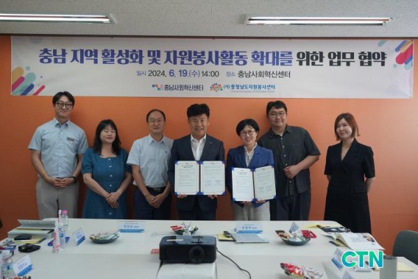 [충남/CTN]가금현 기자 = (사)충청남도자원봉사센터(센터장 박성순)는 지난 19일 충남사회혁신센터(센터장 안경주)와 '충청남도 자원봉사활동 확대 및 지역 활성화'을 위한 업무 협약을 체결했다.