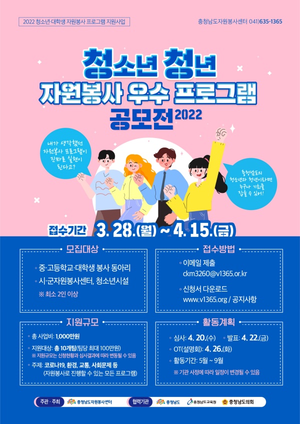 충청남도자원봉사센터(센터장 박성순)는 청소년, 대학생의 자원봉사 활동의 자기 주도적 프로그램 운영과 실천 활동 장려를 위해 ‘2022 청청 자원봉사 우수 프로그램 지원사업 공모전’을 개최한다.