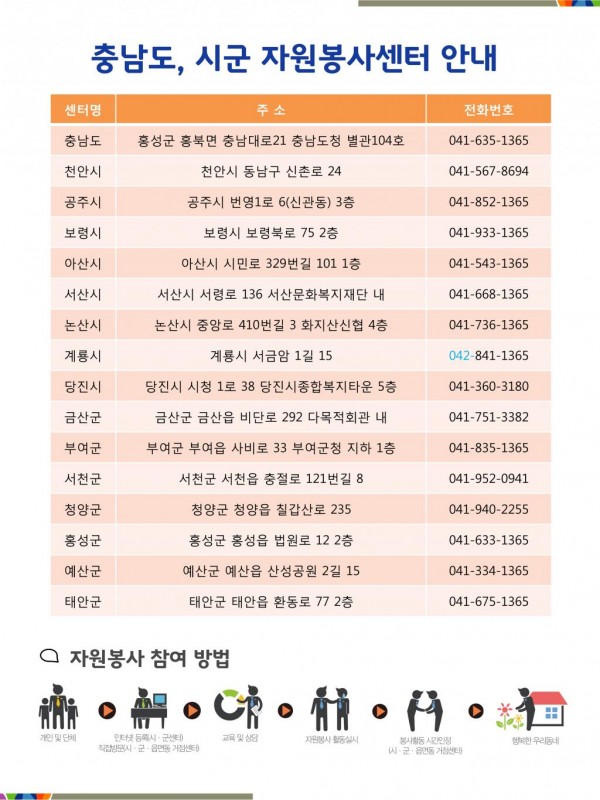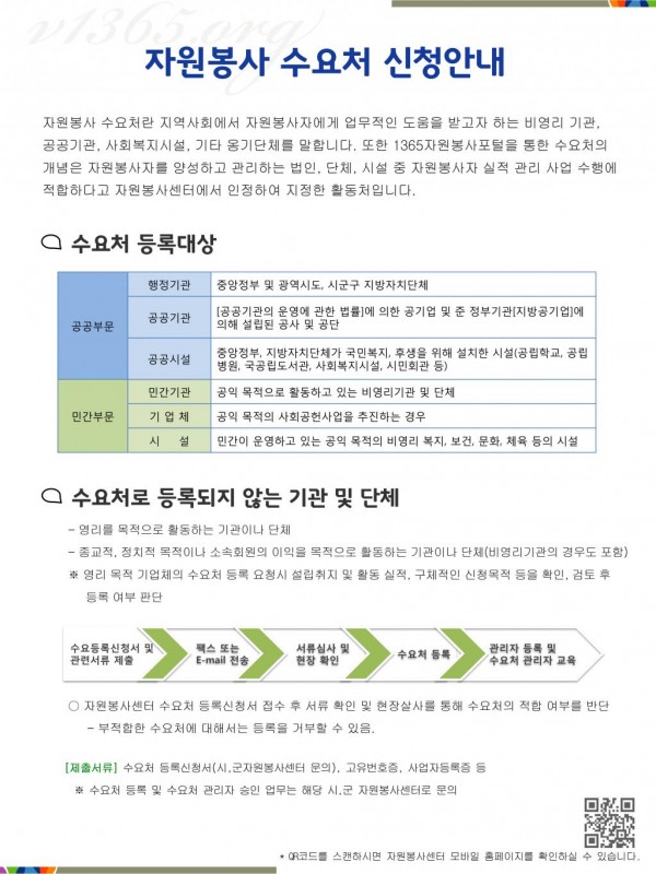 수요처 신청 안내 자료 작성일16-04-15 00:00 조회수 4,688 회 본문 1365자원봉사포털 수요처 등록 신청 안내 자료입니다. 자세한 수요처 등록 절차는 지역 시군 자원봉사센터로 문의해 주시기 바립니다. 목록